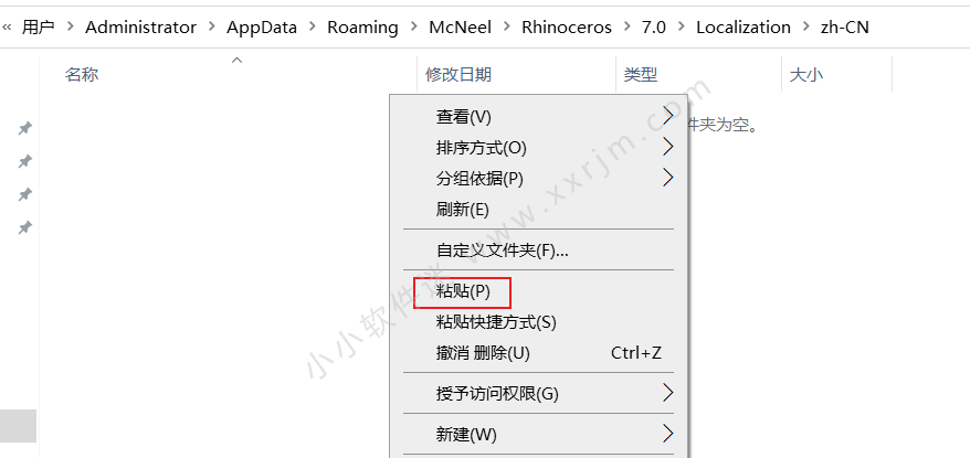 依次找到Roaming—-McNeel—–Rhinoceros—–7.0–Localization文件夹。如果7.0文件夹下没有Localization文件夹,则手动创建。