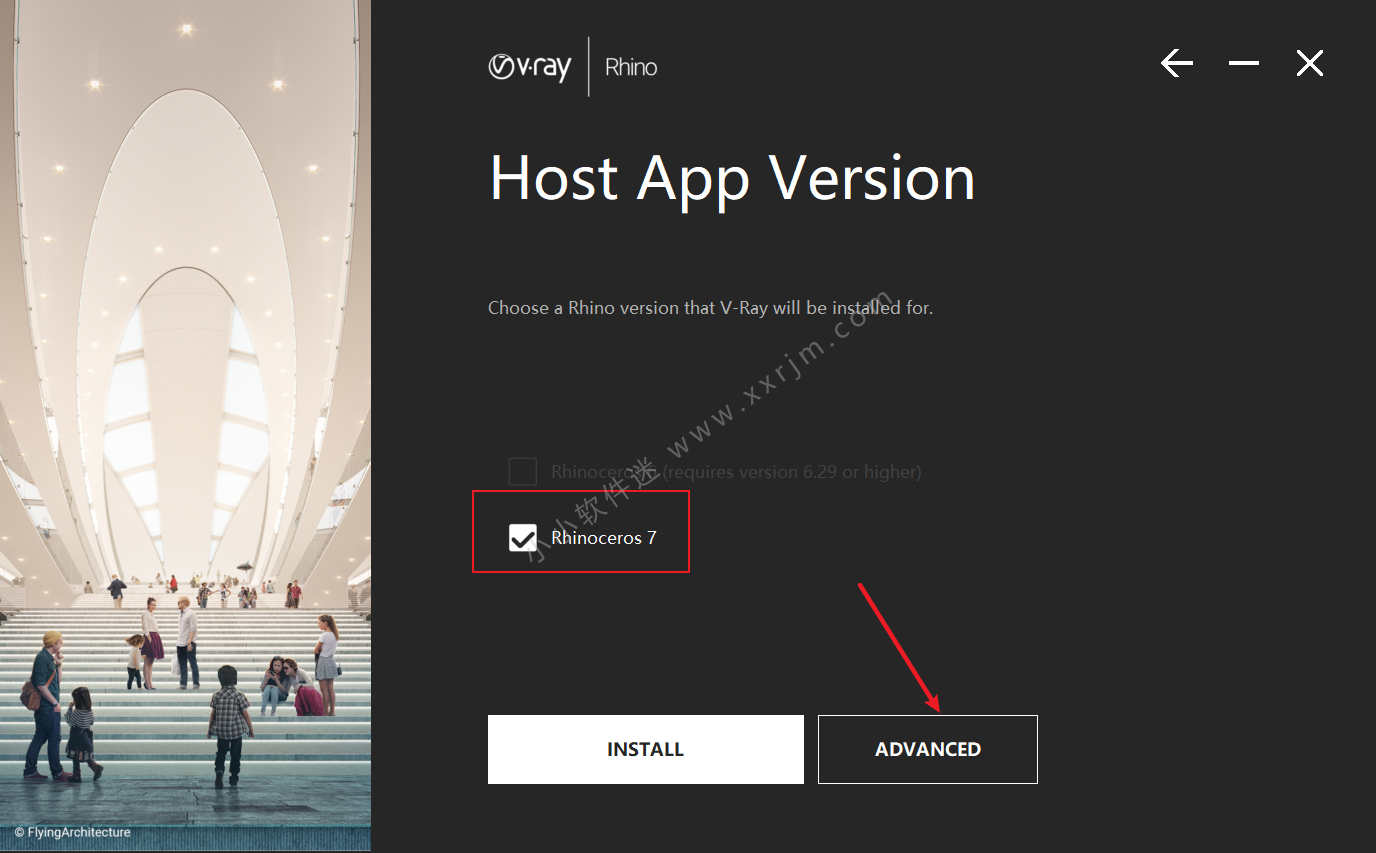 3.软件会自动识别电脑已经安装的Rhino版本,此处以Rhino7为例。点击高级选项“ADVANCED”.