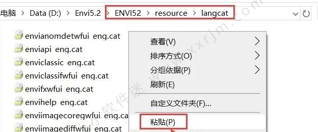38.相继双击打开文件夹至第8步中更改后的安装路径下的【langcat】文件夹,我这里路径为:D:\Envi5.2\ENVI52\resource\langcat,然后鼠标右击空白处选择【粘贴】。