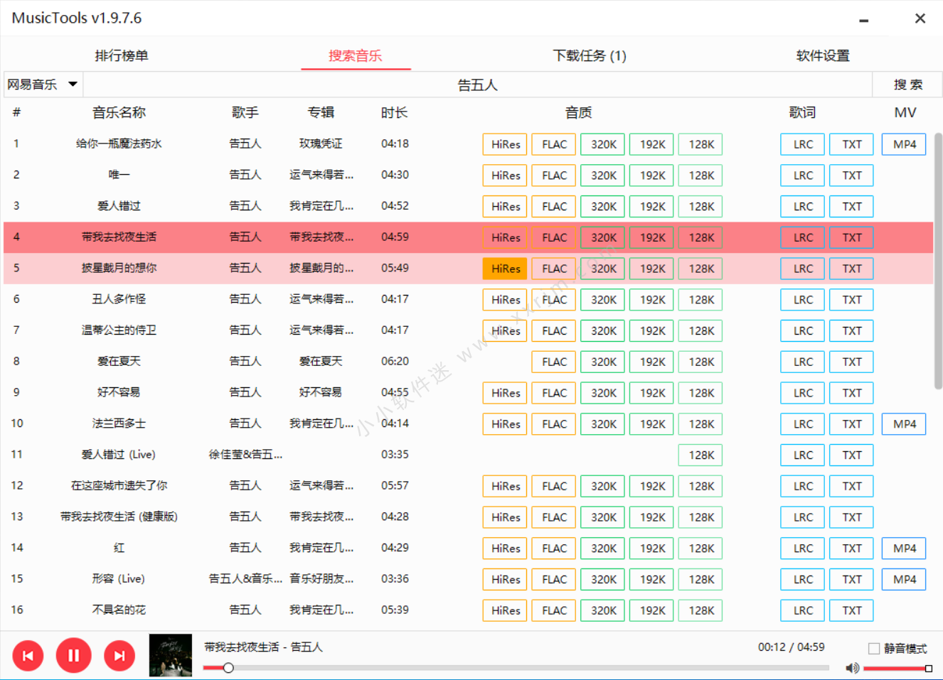 本站提供的盗用音乐平台接口的第三音乐下载工具(MusicTools),仅供个人使用,严禁商业或非法用途,否则因牵涉到音乐版权导致的责任,理因由软件开发者和违规使用者承担,本站特此说明!