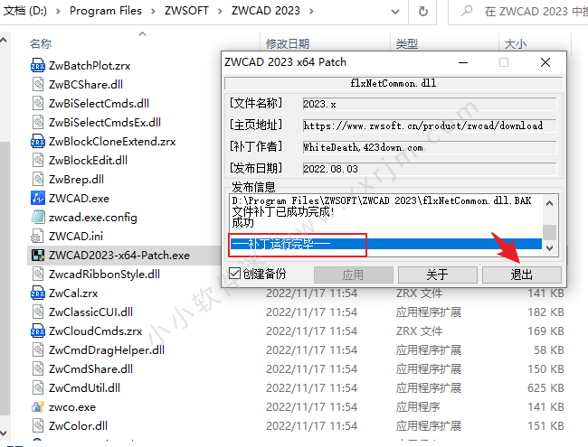 10.提示【补丁运行完毕】,就破解完成了,点击退出。