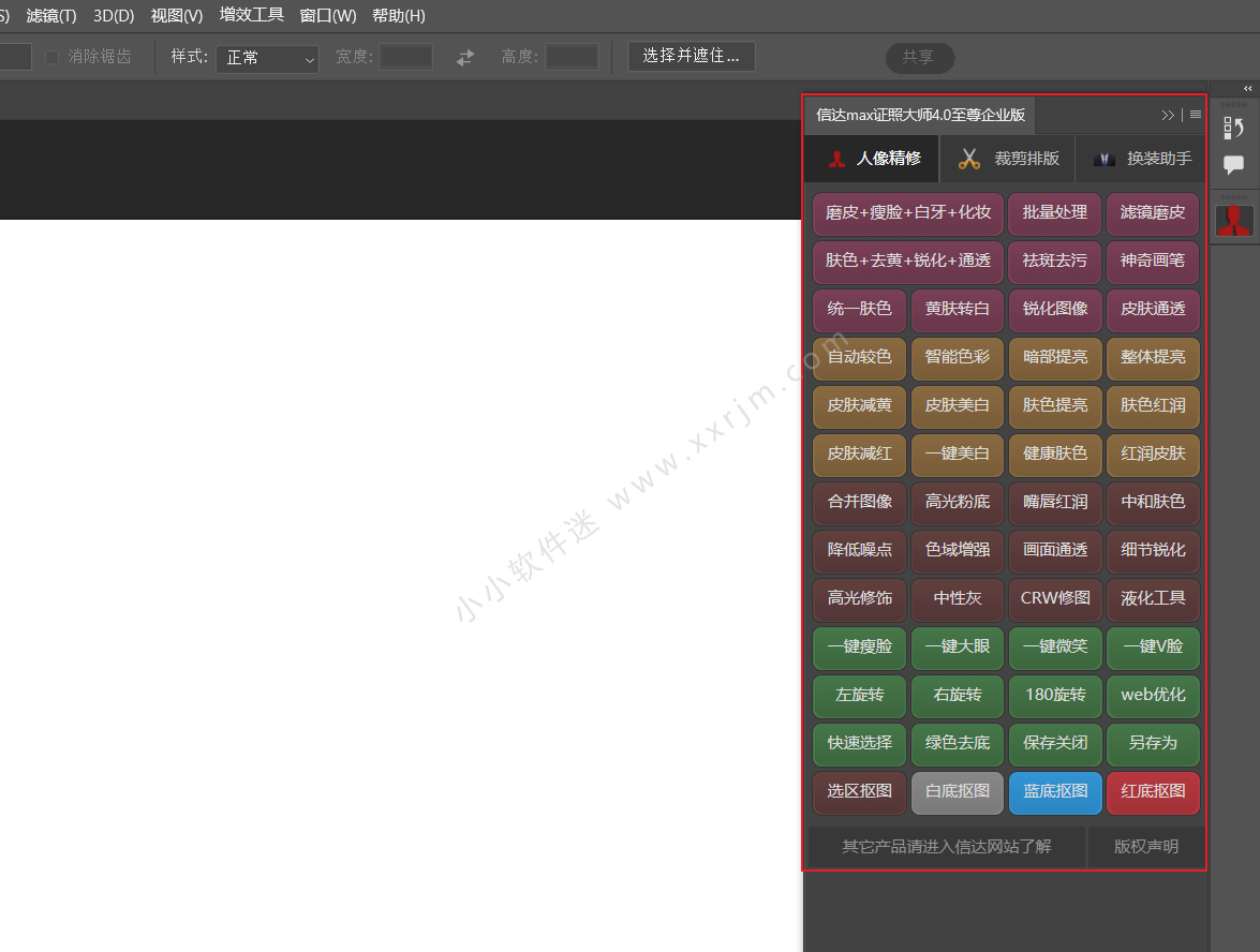 信达MAX证照大师4.0-最美证件照4.0至尊企业版是一款功能齐全的PS插件,使用这款插件来制作证件照不但速度快而且非常美观!让你轻松就可以搞定证件照,都无需太高明的PS技术,用户只需在PS中安装该插件后即可在家自己动手设计证件照,告别以往前去照相馆排队等候的烦恼,让用户既省时又省力,给你生活带来极大的便利。软件可根据用户的拍摄的照片,进行1寸、2寸、3寸等多种形式的切割,还有着美国、台湾、服装等多个模板的排版以及剪切,可自行设计白底以及透明等多种模式,拍摄的照片还可根据需求进行相应的美颜处理,精心设计出最让你满意的证件照信达最美证照大师4.0至尊企业版MAX,一键自动定位换装,一键调色,磨皮,抠图,人脸识别自动裁剪,智能批量排版.