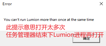 破解完成后有时打开软件提示下图窗口,则任务管理器结束Lumion进程等几秒再打开。