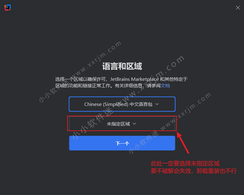 3.下图提示很重要,如果出现未指定区域,直接点击下一步即可,千万不要选择China Mainland,其他区域也不行,保持未指定区域即可。因为2024.2 之后的版本,若初次安装,会提示选择所在区域,如下图所示,如果选择了 China Mainland,会在激活的时候反复跳出激活码并提示激活码无效,原因是新版本会拦截 .cn 域名,导致激活许可被吊销,所以,千万不要指定区域!!