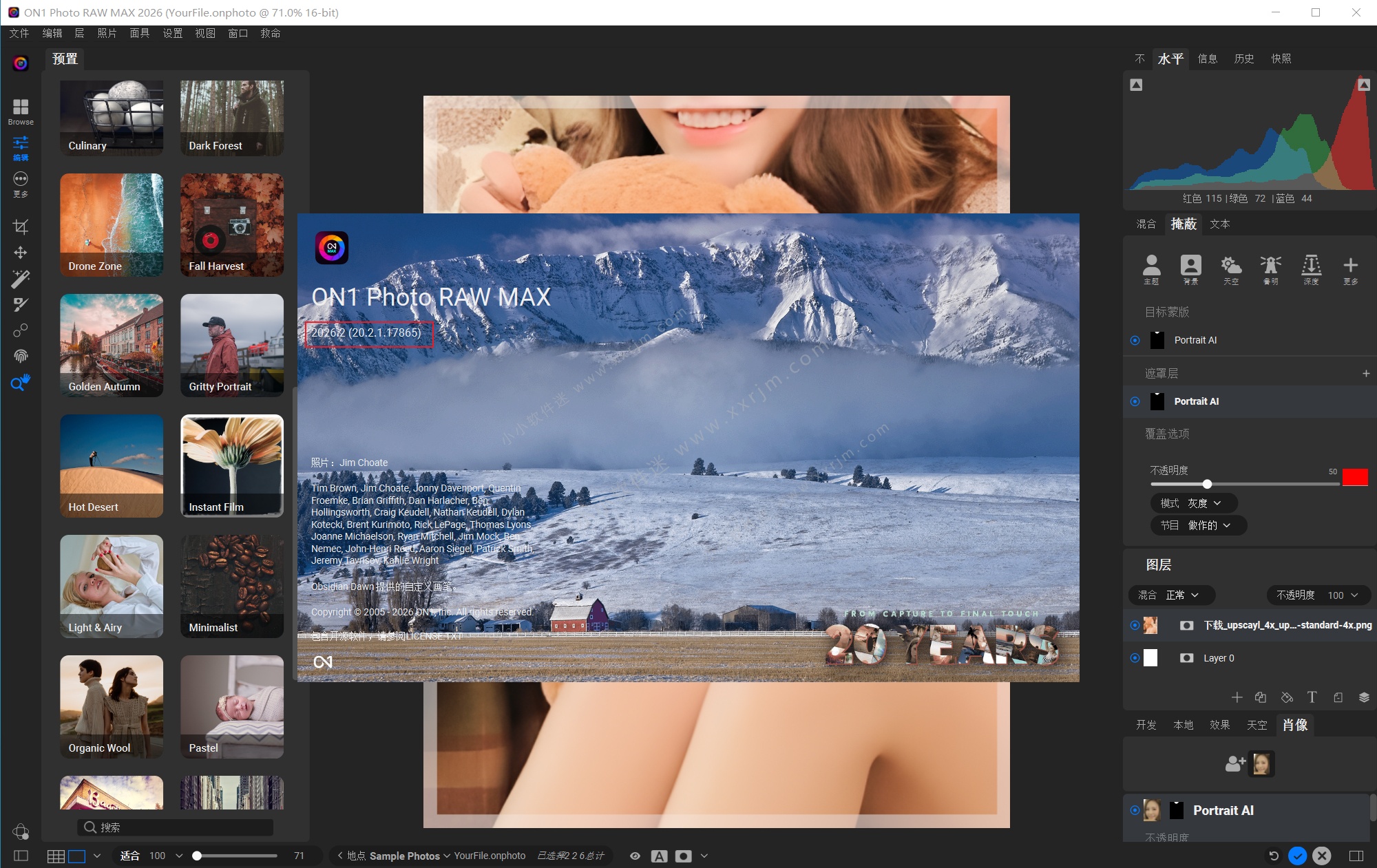 ON1 Photo RAW MAX 2026是一款终极原始照片编辑软件应用程序。使用全新的 ON1 Photo RAW 2026,您可以获得一款集成了强大RAW处理、高级AI工具、传统编辑工具和便捷照片管理的一体化照片编辑软件。无论您是在寻找Lightroom和Photoshop的替代专业软件,还是仅仅想要一个更快、更直观的工作流程,Photo RAW 都能为您提供浏览、编辑、修饰和分享照片所需的一切,无需切换程序。