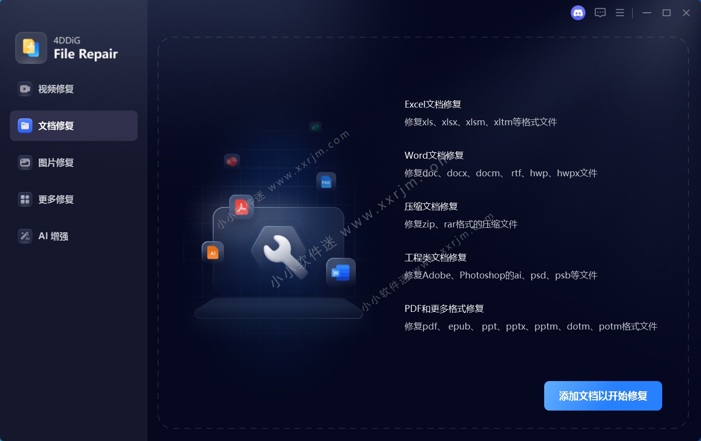 轻松修复损坏的DOCX、DOCM、DOTM、XLSX、XLSM、PPTX、PPTM、POTM、PDF、ZIP、RAR、EPUB、AI、PSD和PSB文件。