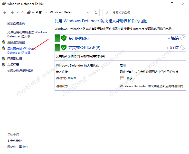 点击“启用或关闭windows defender 防火墙”。