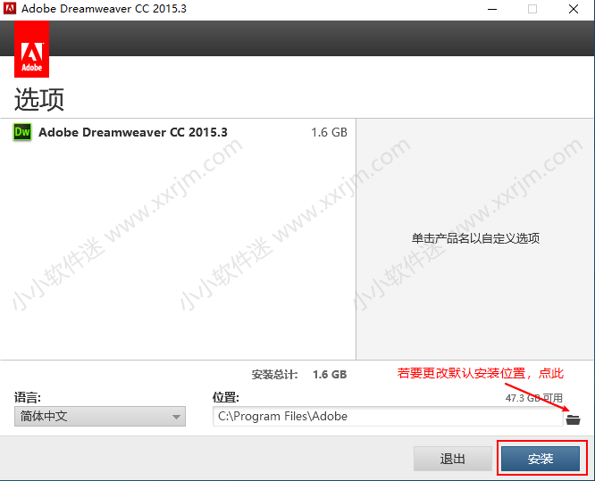 4.程序默认安装在C盘,点击安装即可。如果需要安装在其他盘,按图中指示更改。