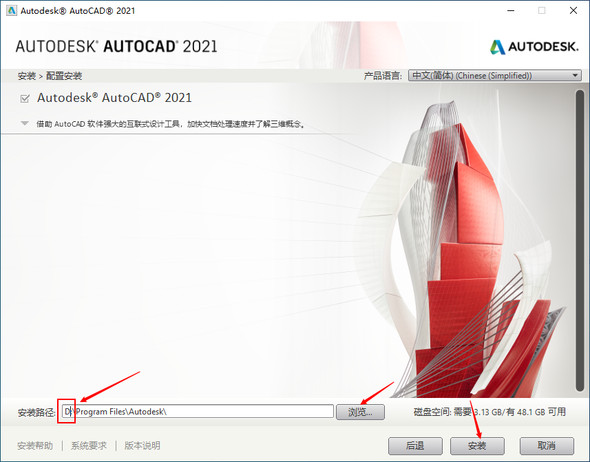 8.点击浏览可以更改CAD2021的安装位置,或者直接修改C盘符号为D,这样快速的修改了安装路径,具体看下图箭头所指位置,点击安装。